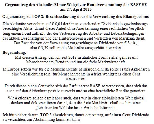 | Möchten Sie an der HV 2023 nicht teilnehmen, bitte ich Sie, mir Ihr Stimmrecht durch Nutzung der BASF-HV-Unterlagen zu übertragen, damit ich TOP 2 ablehnen und den folgenden Antrag stellen kann: | ||
