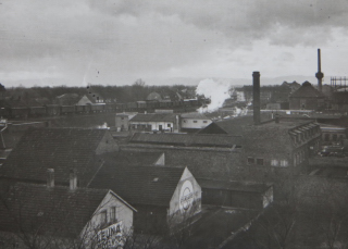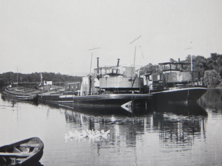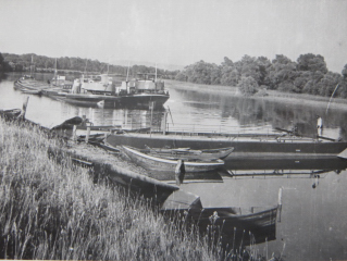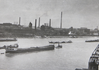 | BASF vom Rhein aus; etwa in Höhe von Tor 7 (um 1950) | Rheinbrücke + Notbrücke; vom Platz d.dt.Einheit aus gesehen |